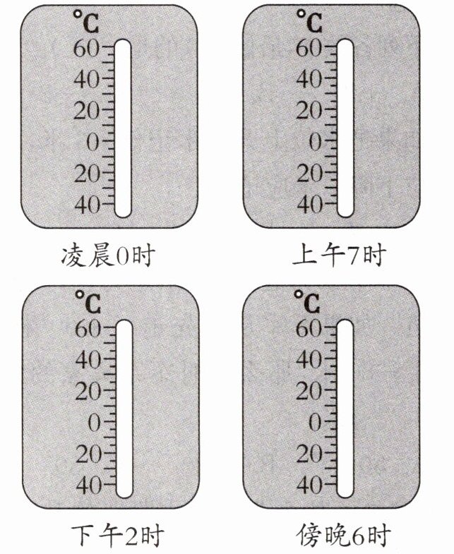 6. 下表列出了某地一天中几个不同时间测得的温度,请你在温度计上画一画。