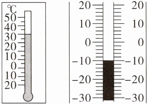 (2)观察右上图的温度计,显示零下$10^{\circ}C$,零下$10^{\circ}C$可以记作( ),-10 读作( )。