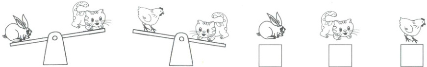 行比较,分出轻重,再逐一比较。观察原图可知,小白兔比小花猫重,小花猫比老母鸡重,可见老母鸡最轻,画“√”;小白兔最重,画“$○$”。