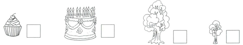 (1)大的画“√”,小的画“$○$”。 (2)高的画“√”,矮的画“$○$”。
