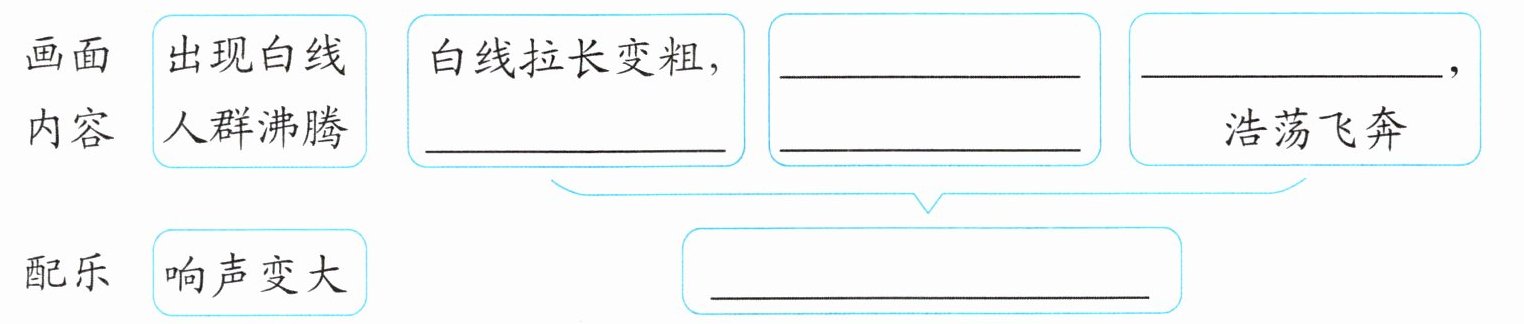 画面内容:出现白线,人群沸腾;白线拉长变粗,______;______,______;______,浩荡飞奔