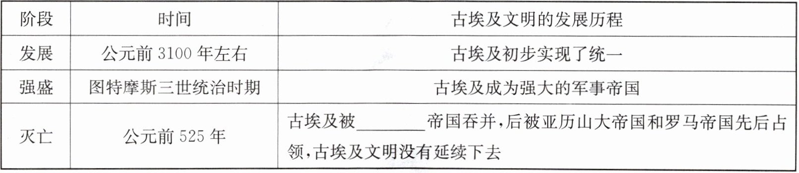 |灭亡|公元前525年|古埃及被______帝国吞并,后被亚历山大帝国和罗马帝国先后占领,古埃及文明没有延续下去|
