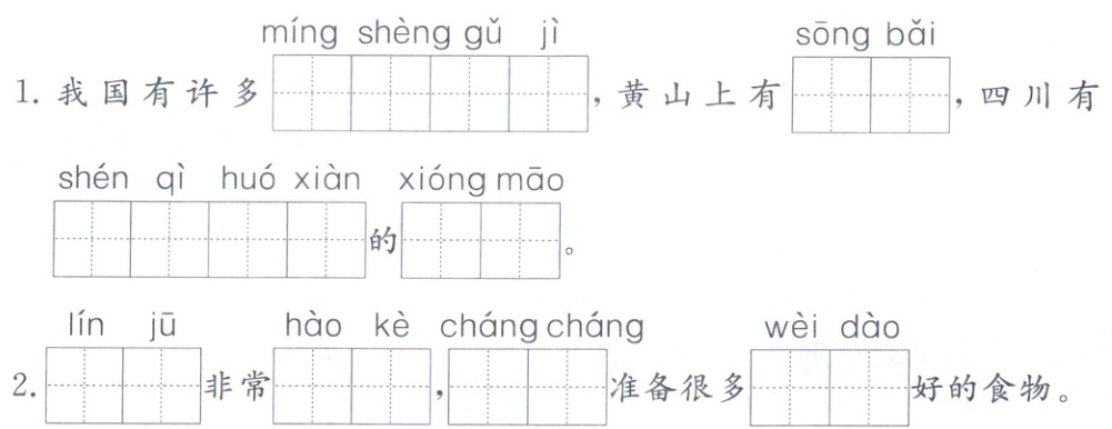 1.名胜古迹 松柏 神气活现 熊猫 2.邻居 好客 常常 味道 【点评】本题考查在具体语境中看拼音写词语的能力。根据所学拼音知识进行拼读,写出相应的词语即可。拼读时要注意所给音节的声母、韵母及声调。注意“熊、邻”等易错字的书写。