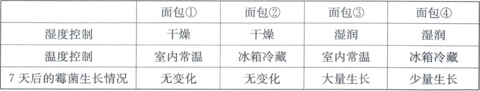 8. 小明在四块相同的干面包上分别放一些霉菌,然后放置在不同环境中培养。7 天后,观察四块面包上的霉菌生长情况,并记录在下表中。