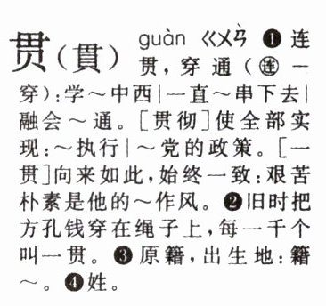 千万匹白色战马齐头并进,浩浩荡荡地飞奔而来;那声音如同山崩地裂,好像大地都被震得颤动起来。(1) “贯”字在字典里的意思有这样几种(见右图)。“横贯江面”一词中,“贯”字的意思是(填序号),这个词语写出了潮水。