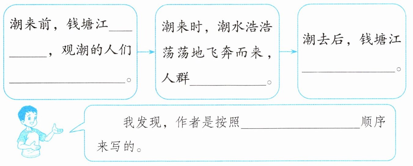 风平浪静 昂首东望,盼着潮水到来 人群沸腾起来 恢复了平静 事情发展