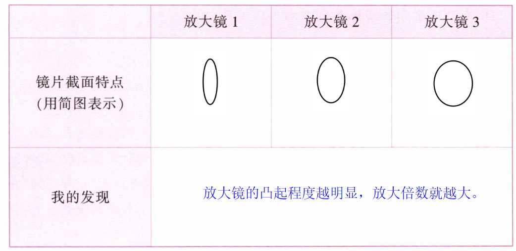 | 我的发现 | 中间厚边缘薄的镜片能放大物体图像 | 厚度均匀的镜片不能放大物体图像 | 中间薄边缘厚的镜片不能放大物体图像 |