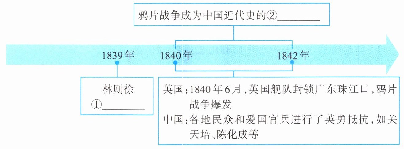林则徐 ①______ 英国:1840年6月,英国舰队封锁广东珠江口,鸦片战争爆发