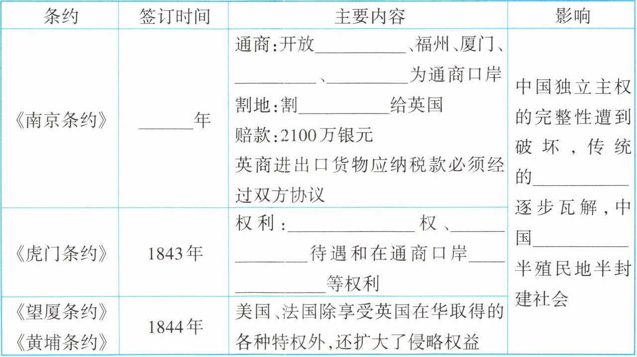 |《南京条约》|______年|通商:开放______、福州、厦门、______、______、______为通商口岸割地:割______给英国赔款:2100万银元英商进出口货物应纳税款必须经过双方协议|中国独立主权的完整性遭到破坏,传统的______逐步瓦解,中国半殖民地半封建社会|