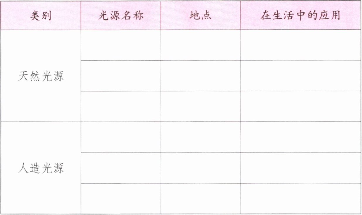 光源分为天然光源和人造光源,找一找周围有哪些天然光源和人造光源,根据类别记录在下页的表格中。
