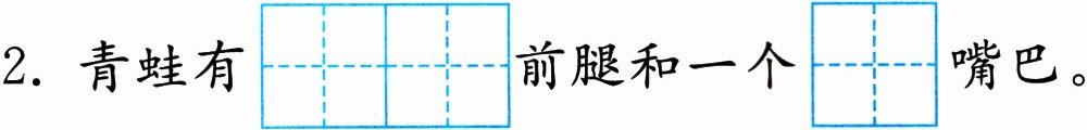 2. 青蛙有$\overset{\mathrm{l}\mathrm{i}ǎ\mathrm{n}\mathrm{g} \mathrm{t}\mathrm{i}á\mathrm{o}}{\begin{array}{|c|c|c|c|}\hline & & & \\\hline\end{array}{\begin{array}{|c|c|c|c|}\hline & & & \\\hline }前腿和一个\overset{\mathrm{k}\mathrm{u}ā\mathrm{n}}{\begin{array}{|c|c|}\hline & \\\hline\end{array}{\begin{array}{|c|c|}\hline & \\\hline }$嘴巴。