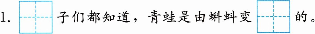 1. $\overset{\mathrm{h}á\mathrm{i}}{\begin{array}{|c|c|}\hline & \\\hline\end{array}{\begin{array}{|c|c|}\hline & \\\hline }$子们都知道,青蛙是由蝌蚪变$\overset{\mathrm{ch}é\mathrm{n}\mathrm{g}}{\begin{array}{|c|c|}\hline & \\\hline\end{array}{\begin{array}{|c|c|}\hline & \\\hline }$的。