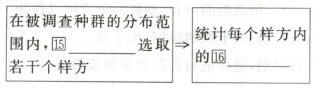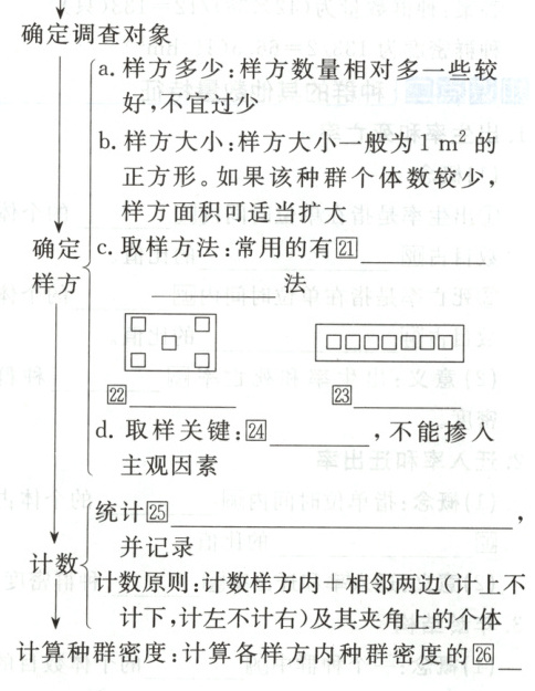②适用范围:34[18]植物 以及活动能力35[19]不强 、活动范围36[20]较小 的动物,如调查草地上蒲公英的密度,农田中某种昆虫卵的密度,作物植株上蚜虫的密度、跳蝻的密度等。