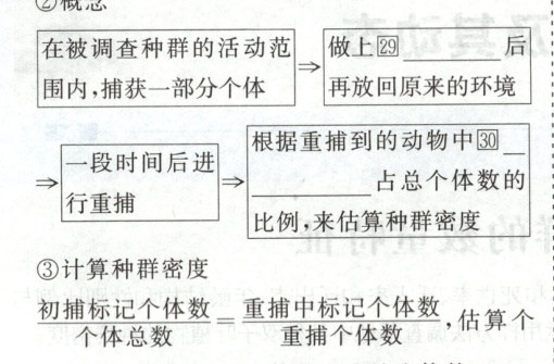 1一定的空间 2同种 3所有 4种群密度 5出生率和死亡率 6年龄结构 7最基本的数量特征 8单位面积或单位体积 9濒危动物 10监测和预报 11捕捞强度 12较大 13趋光性 14估算 15随机 16个体等距取样法 17平均值 18植物 19弱 20小 21五点取样法和 25每个样方内所调查植物的数量 26平均值 27强 28大 29标记 30标记个体数