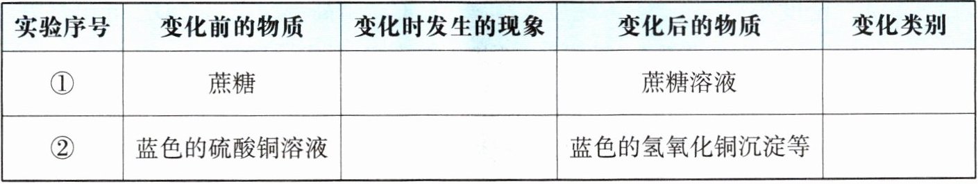 | ① | 蔗糖 | 蔗糖固体逐渐溶解,形成无色溶液 | 蔗糖溶液 | 物理变化 |