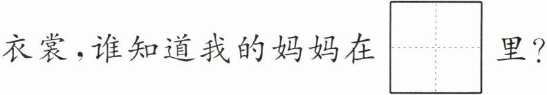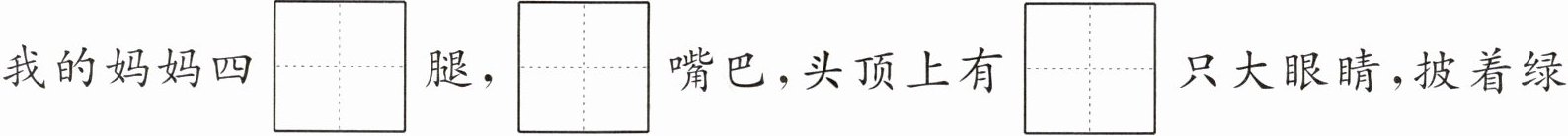 我的妈妈四$\begin{array}{|c|} \hline tiáo \\ \hline \end{array}\\ \hline $腿,$\begin{array}{|c|} \hline kuān \\ \hline \end{array}\\ \hline $嘴巴,头顶上有$\begin{array}{|c|} \hline liǎng \\ \hline \end{array}\\ \hline $只大眼睛,披着绿衣裳,谁知道我的妈妈在$\begin{array}{|c|} \hline nǎ \\ \hline \end{array}\\ \hline $里?
