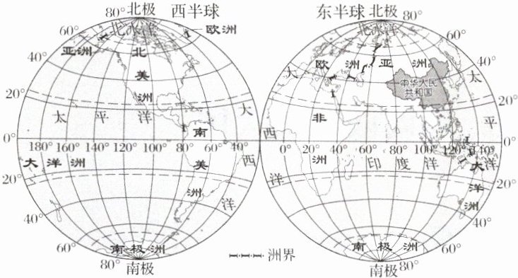 动手画一画 请你在下图中用红笔描出赤道、北回归线、北极圈、20°W、160°E。