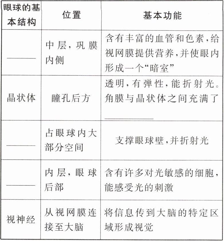|晶状体|瞳孔后方|透明,有弹性,能折射光。角膜与晶状体之间充满了____|