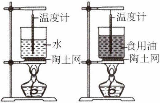2. 如图所示,在“比较不同物质吸收热量的情况”的实验中,取适量质量、初温均相同的水和食用油分别装在两个相同的烧杯中,用两个规格相同的酒精灯加热,每隔 1 min 记录一次数据,如表所示。