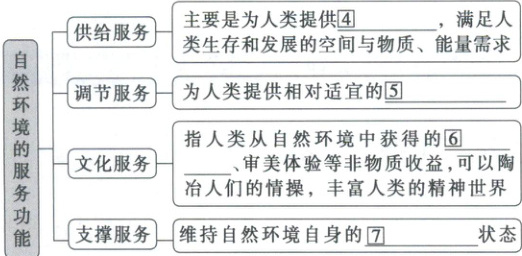 人类从自然环境中获得的各种③______,就是自然环境的服务功能。具体如下图所示。