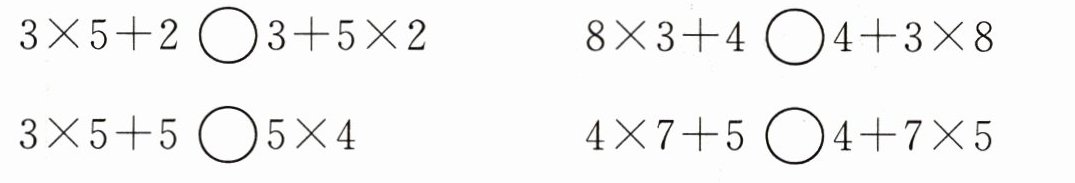 $3×5 + 2$ $◯$ $3 + 5×2$ $8×3 + 4$ $◯$ $4 + 3×8$