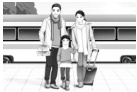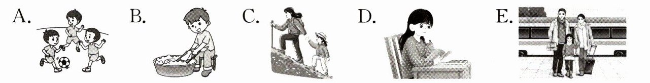 一、新学期开学第一天,Lisa 在公交车站遇到了同班同学 Anna,两人聊了起来。听句子或对话,用数字 1—5 给下列图片排序。