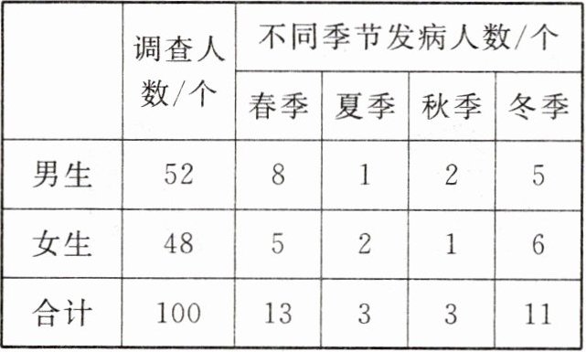 4. 某探究小组随机调查了本校八年级 100 个学生在 2024 年不同季节流感的发病情况,结果见下表。请完成下列习题。
