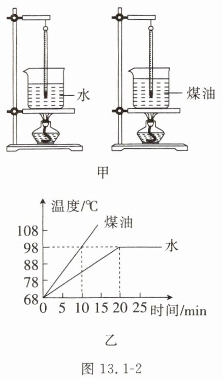 4. 如图13.1-2甲所示,某同学用相同的酒精灯分别给水和煤油加热,以比较水和煤油的吸热能力。