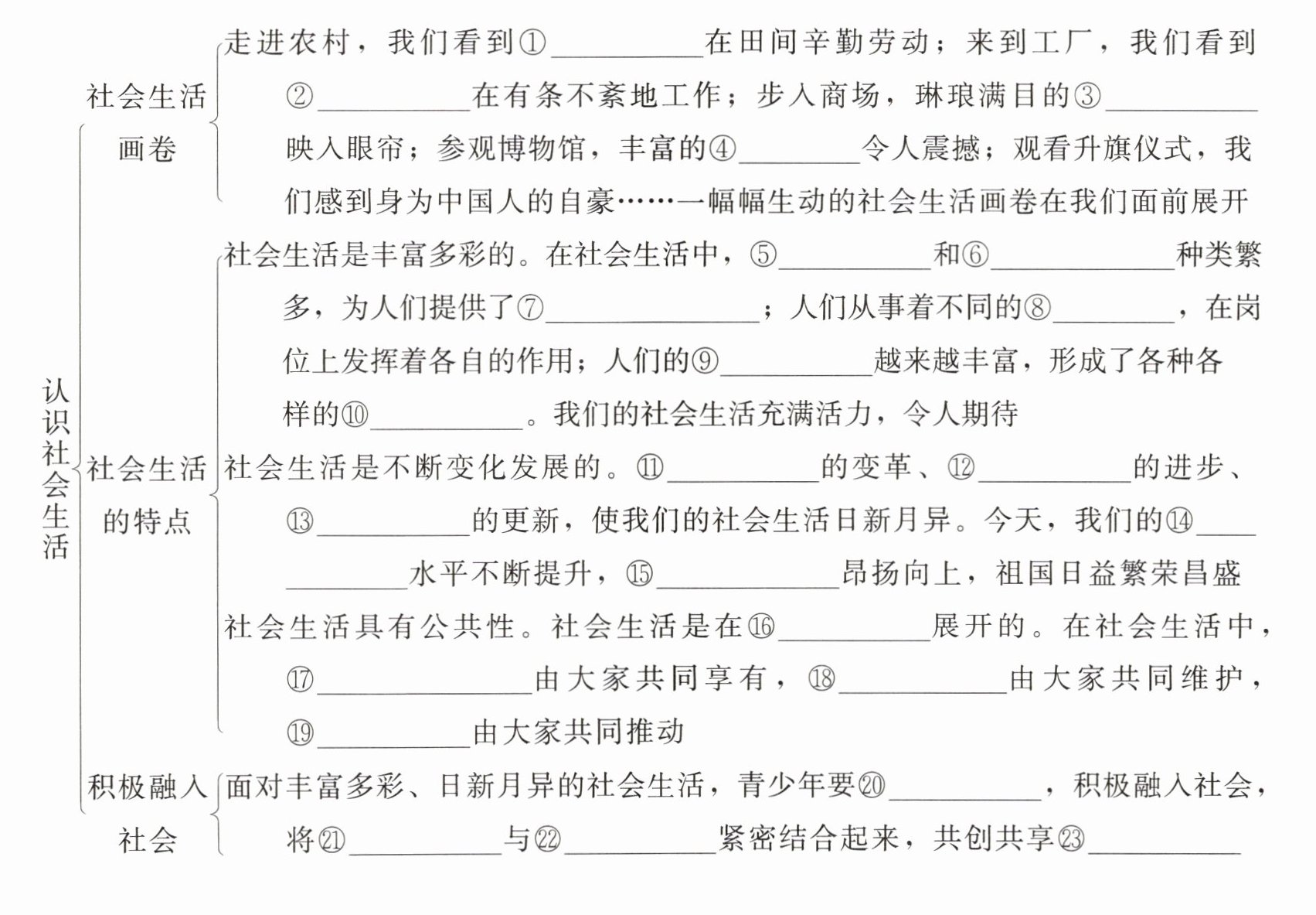 1. ①农民 ②工人 ③商品 ④展品 ⑤物质产品 ⑥精神食粮 ⑦多样化选择 ⑧职业 ⑨交往方式 ⑩社会关系 ⑪生产工具 ⑫科学技术 ⑬思想观念 ⑭物质生活 ⑮精神面貌 ⑯公共空间 ⑰社会公共利益 ⑱社会秩序 ⑲社会发展 ⑳热爱生活 ㉑个人发展 ㉒社会进步 ㉓美好生活