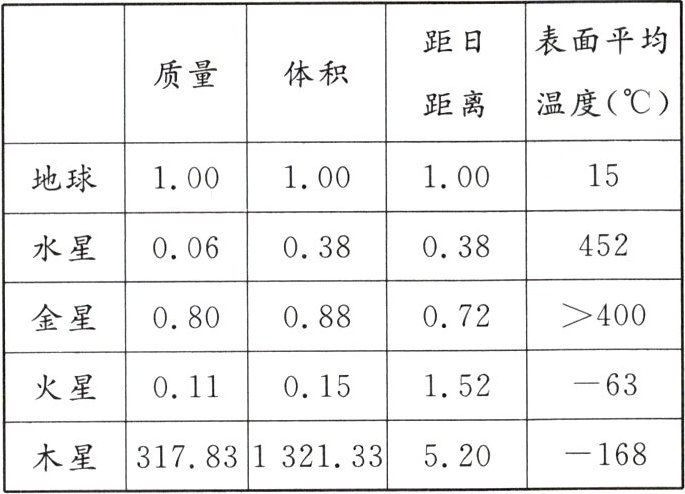 材料二 下表示意地球、水星、金星、火星、木星数据比较(质量、体积、距日距离以地球数据为 1 个单位)。