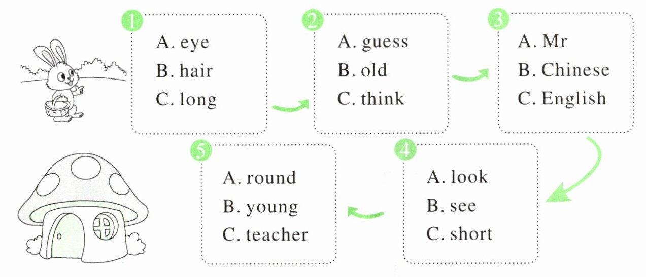 一、圈出下列每组单词中不同类的一项,帮助小兔子回家。