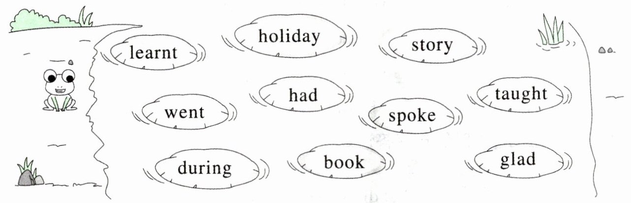 小青蛙只有借助写有动词过去式的荷叶才能跳到河对岸,快帮它找出来并涂色吧!
