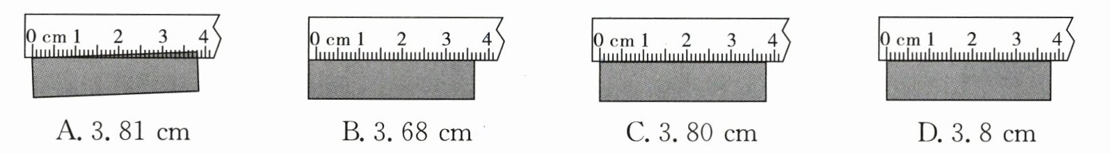 2.C 解析:刻度尺有刻度线的一侧应该紧靠工件,故A错误;0刻度线或其他整数刻度线应该与工件左侧对齐,故B错误;刻度尺0刻度线与工件左侧对齐,并且被测边紧靠刻度线,刻度尺的分度值为1mm,其读数为3.80cm,故C正确,D错误。