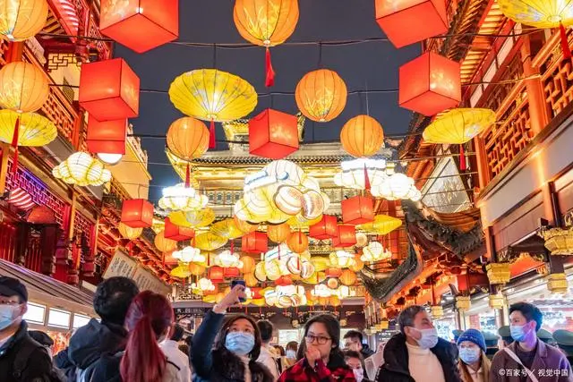 月上柳梢,豫园灯会,灯笼高挂,红烛摇曳,映照着绚烂的霓虹。