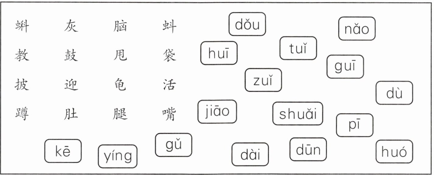 kē—蝌;huī—灰 ;nǎo—脑;dǒu—蚪;jiāo—教;gǔ—鼓;shuǎi—甩;dài—袋;pī—披;yíng—迎;guī—龟;huó—活;dūn—蹲;dù—肚;tuǐ—腿;zuǐ—嘴。