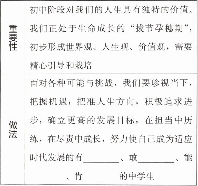|做法|面对各种可能与挑战,我们要珍视当下,把握机遇,把准人生方向,积极追求进步,确立更高的发展目标,在担当中历练,在尽责中成长,努力使自己成为适应时代发展的有______、敢______、能______、肯______的中学生|