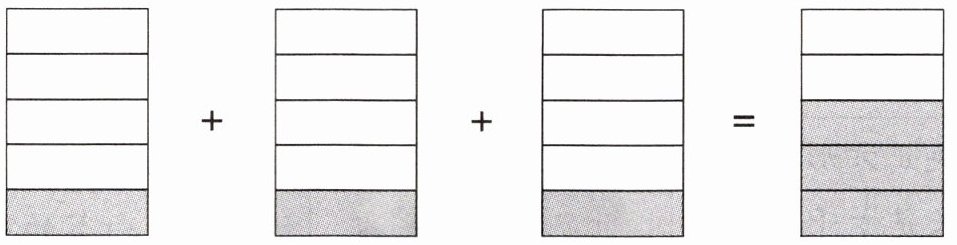 1. $\frac{1}{5} + \frac{1}{5} + \frac{1}{5} = \frac{3}{5}$ $\frac{1}{5} × 3 = \frac{3}{5}$
