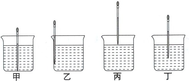 图丁 温度计的玻璃泡不能碰到容器底和容器壁.