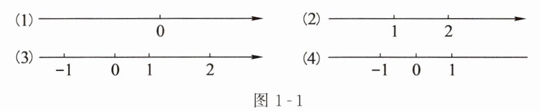 例 1 图 1 - 1 是四名同学画的四条数轴,请你说一说,他们画的数轴是否正确,为什么?请你根据数轴的定义画一条数轴.、