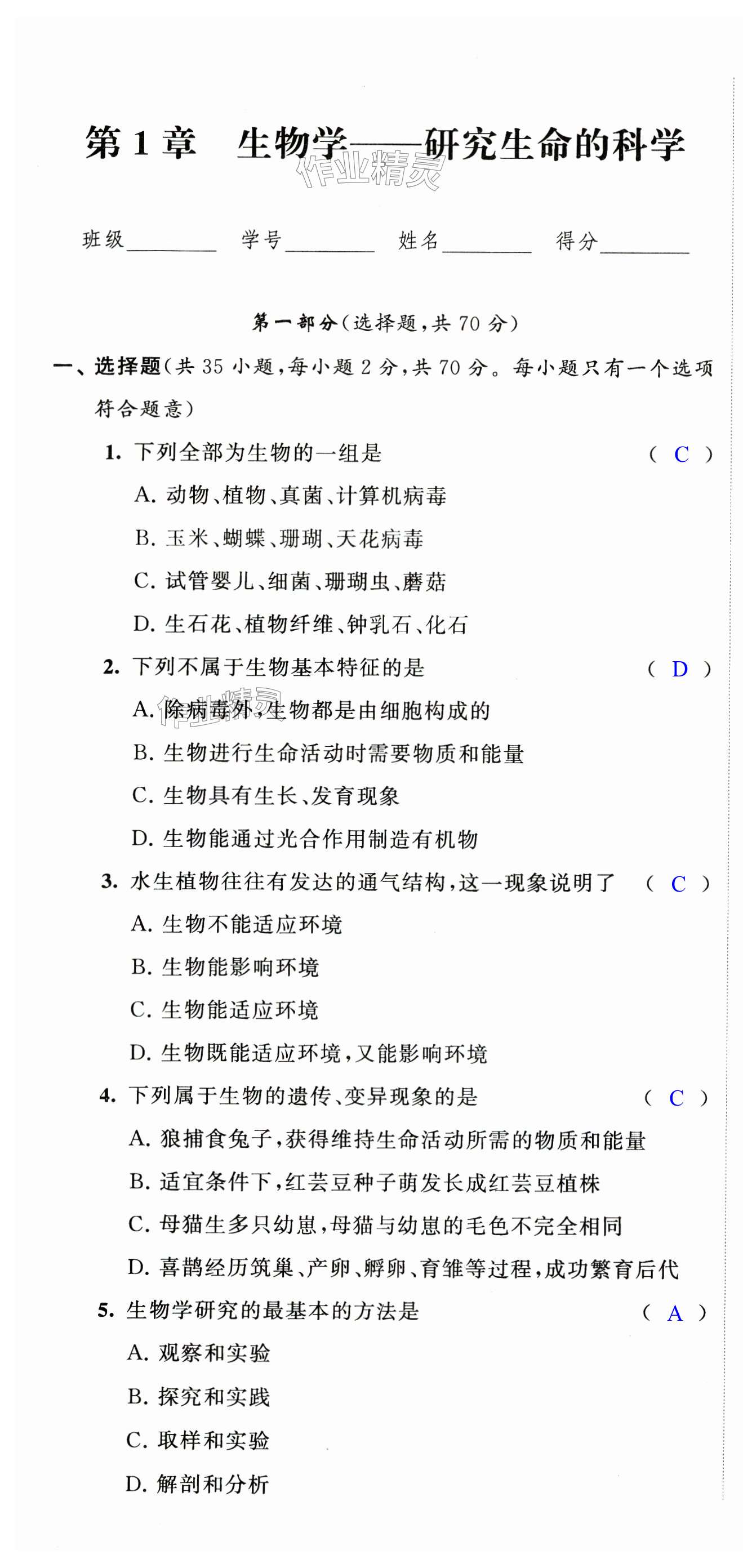 注:目前有些书本章节名称可能整理的还不是很完善,但都是按照顺序排列的,请同学们按照顺序仔细查找。练习册 2024年阳光互动绿色成长空间七年级生物上册苏科版提优版 答案主要是用来给同学们做完题方便对答案用的,请勿直接抄袭。