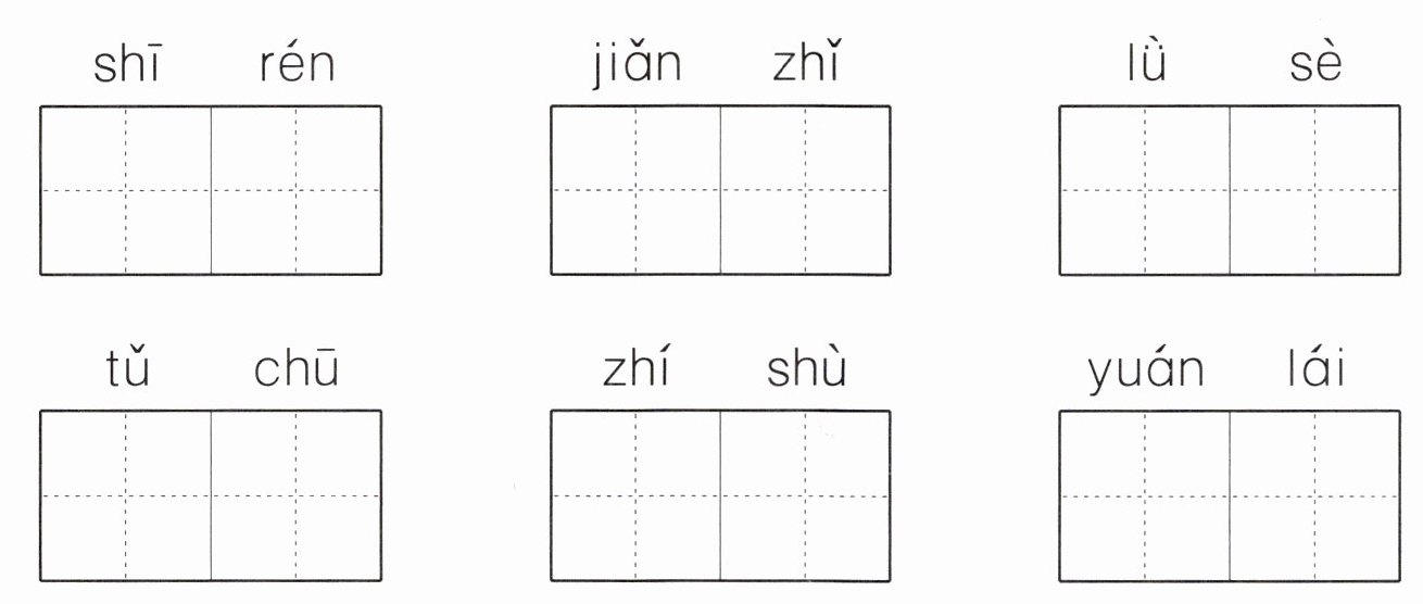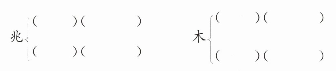 示例:$\left\{\begin{array}{l}\text{桃 桃子}\\ \text{跳 跳高}\end{array}\right.$$\left\{\begin{array}{l}\text{植 植树}\\ \text{柳 杨柳}\end{array}\right.$