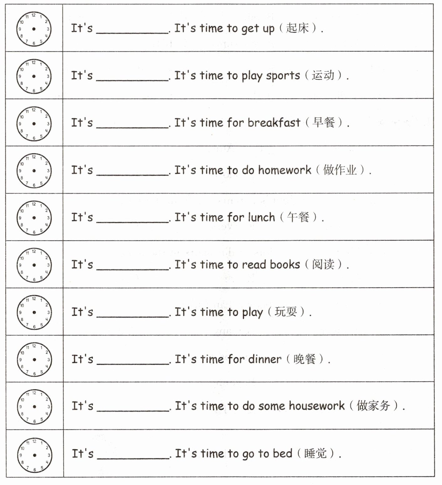 10. 睡觉时间可以是晚上9点,画时针指向9,分针指向12,写作:It's 9 o'clock.