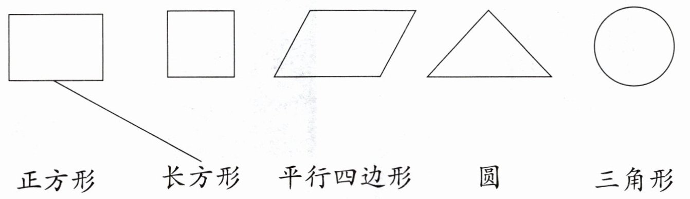 【答案】:第一个图形(长方形)与“长方形”相连;第二个图形(正方形)与“正方形”相连;第三个图形(平行四边形)与“平行四边形”相连;第四个图形(三角形)与“三角形”相连;第五个图形(圆)与“圆”相连。