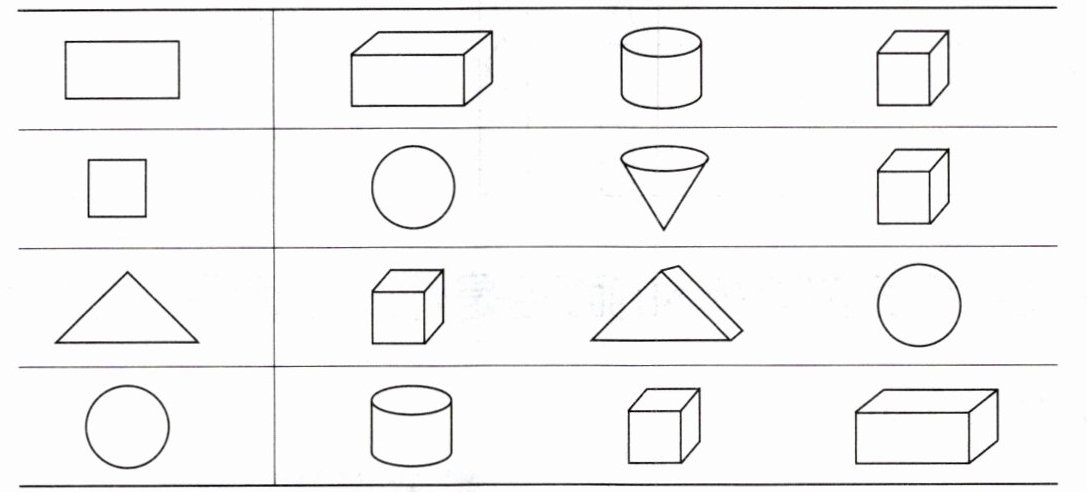 【答案】:第一行圈长方体;第二行圈正方体;第三行圈三棱柱;第四行圈圆柱(或圆锥,因为圆锥底面也是圆,但图中圆锥在第二行,若按行对应,第四行左边是圆,第四行物体中圆柱底面是圆,所以优先圈圆柱)。