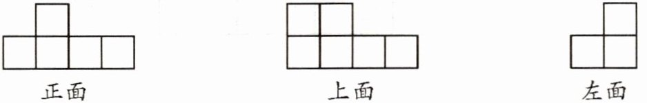 从正面看,有2层,下层4个,上层1个在中间;从上面看,有2行,前行4个,后行2个在左起第一、二列;从左面看,有2层,下层2个,上层1个在后面。