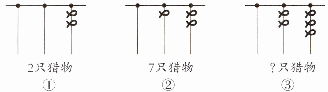 3. 传统文化 结绳计数 在《易经》中有“上古结绳而治”的记载。它是指人们用绳子打结来记录数量,即“结绳计数”。下列各图记录猎物只数的规则是“从右往左,满五进1”,则图③表示的是()只猎物。