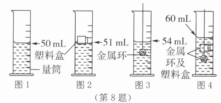 8. 教材P15探究实践·变式 塑料盒不能沉入水中。为了测量它的体积,某同学采用了如图所示的方法(绳子体积忽略不计),下列说法正确的是()。
