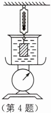 4. 小吴同学为探究力之间的关系做了如图所示的实验。将弹簧测力计下端吊着的铝块逐渐浸入台秤上盛有水的烧杯中,直至铝块刚没入水中(不接触容器,无水溢出)。在该过程中,下列有关弹簧测力计和台秤示数的说法正确的是()。