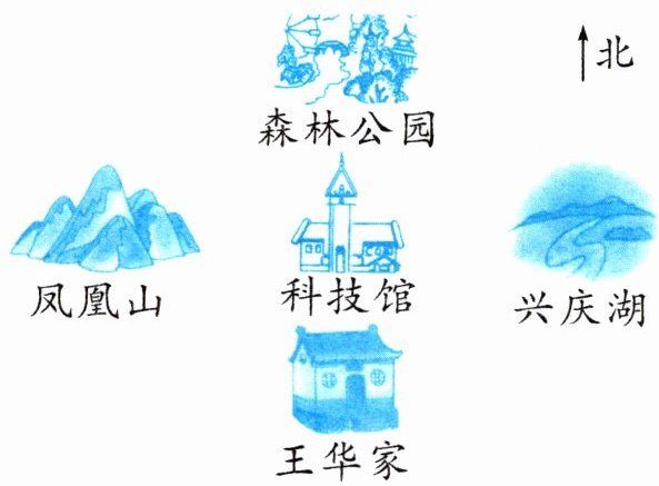 ①科技馆在森林公园的()面,在王华家的()面,兴庆湖在科技馆的()面,凤凰山在科技馆的()面。
