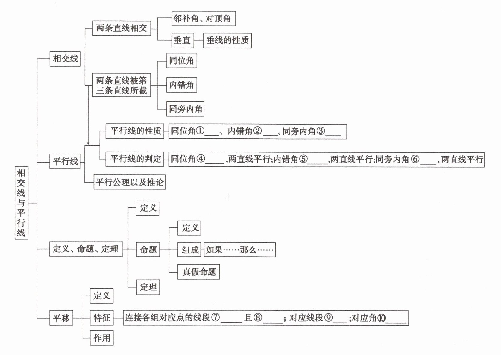①相等 ②相等 ③互补 ④相等 ⑤相等 ⑥互补 ⑦平行(或在同一条直线上) ⑧相等 ⑨平行(或在同一条直线上)且相等 ⑩相等
